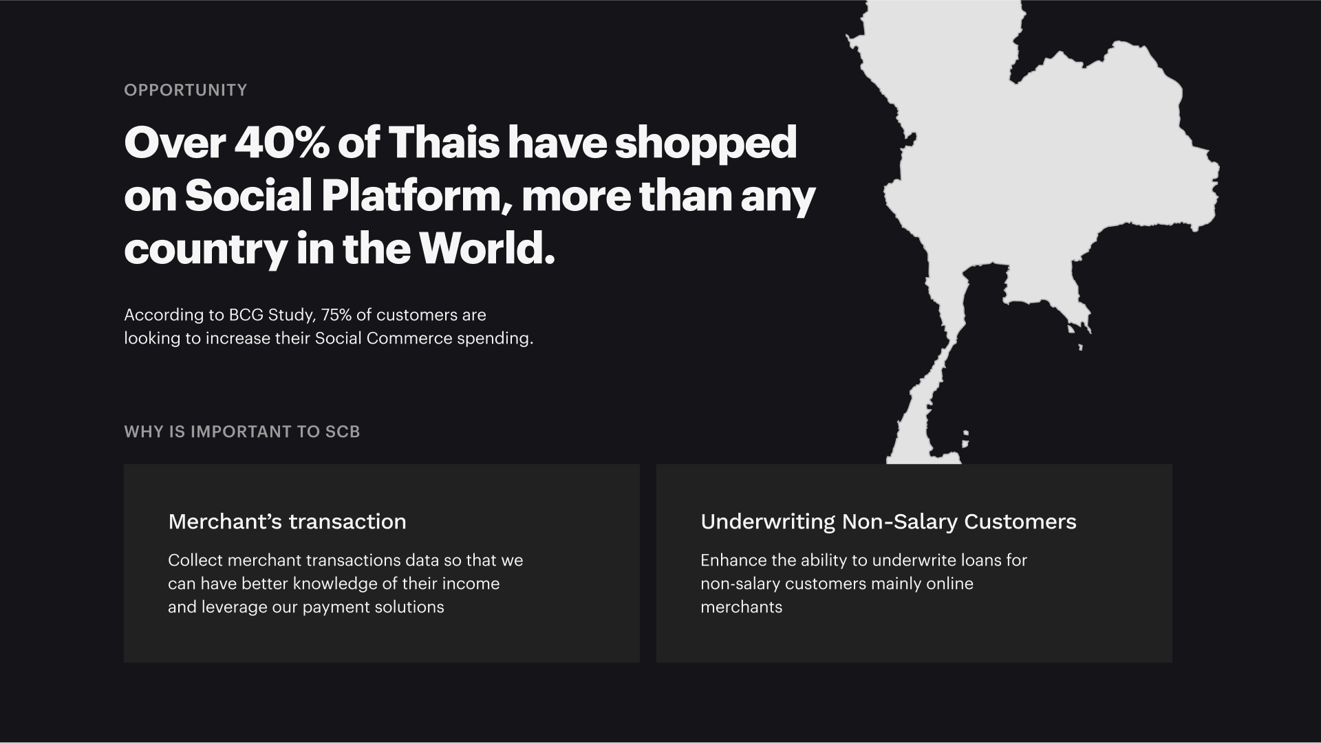 From our research, we found that over 40% of Thais have shopped on social media platforms, more than any country in the World. There is a huge growth in industry based on BCG research (75% in growth)